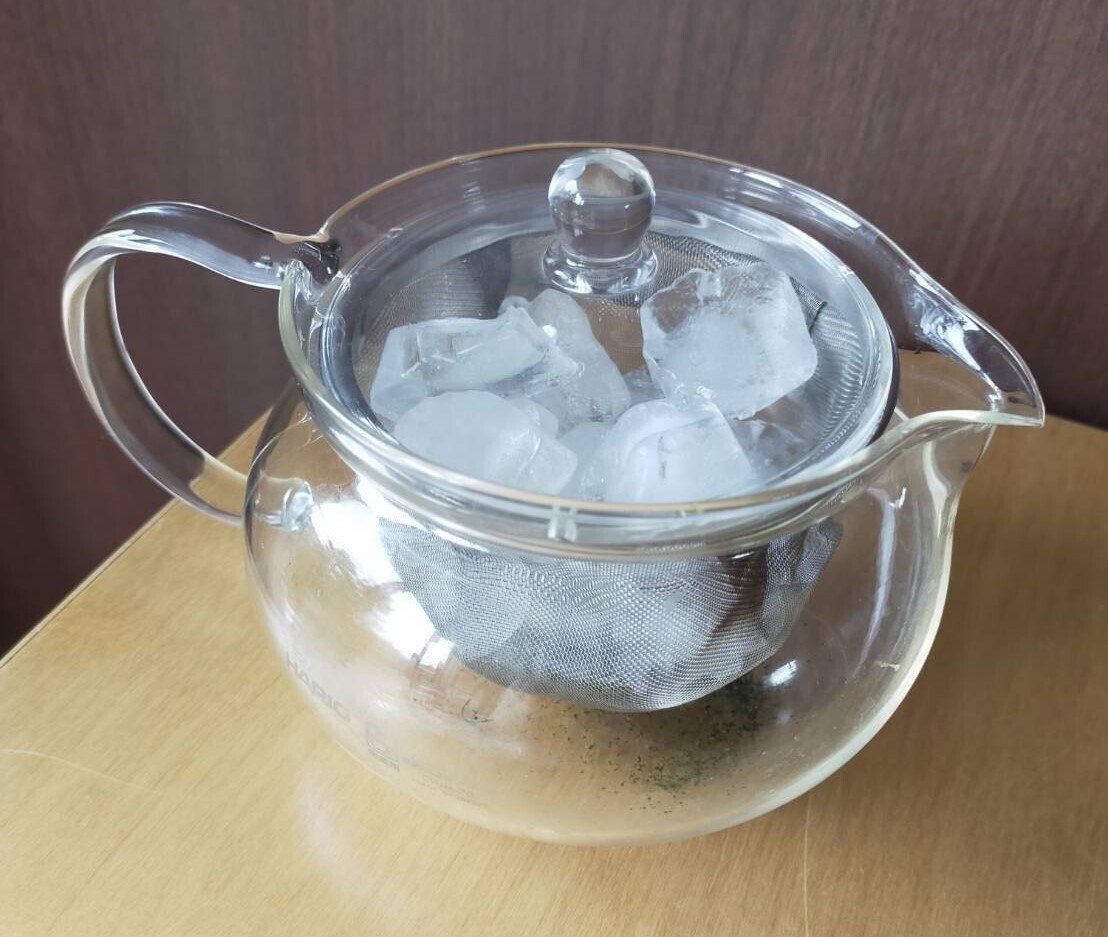 急須やティーポットに茶葉 6g入れて、氷をいっぱいまで入れます。