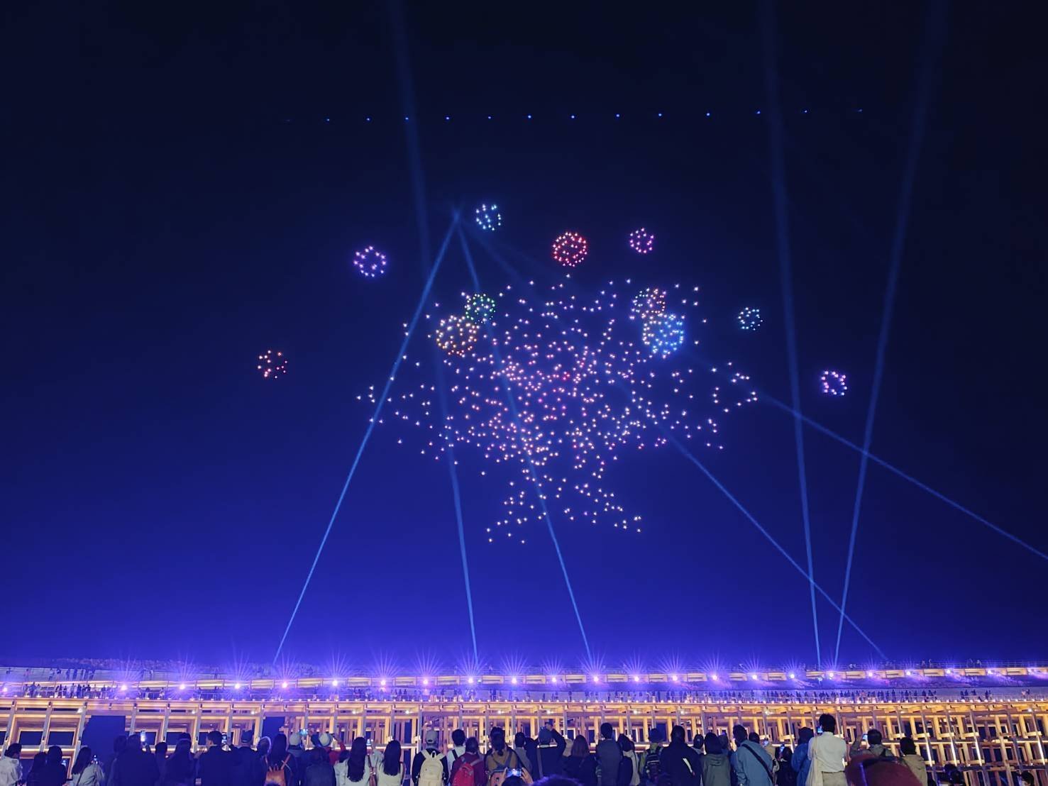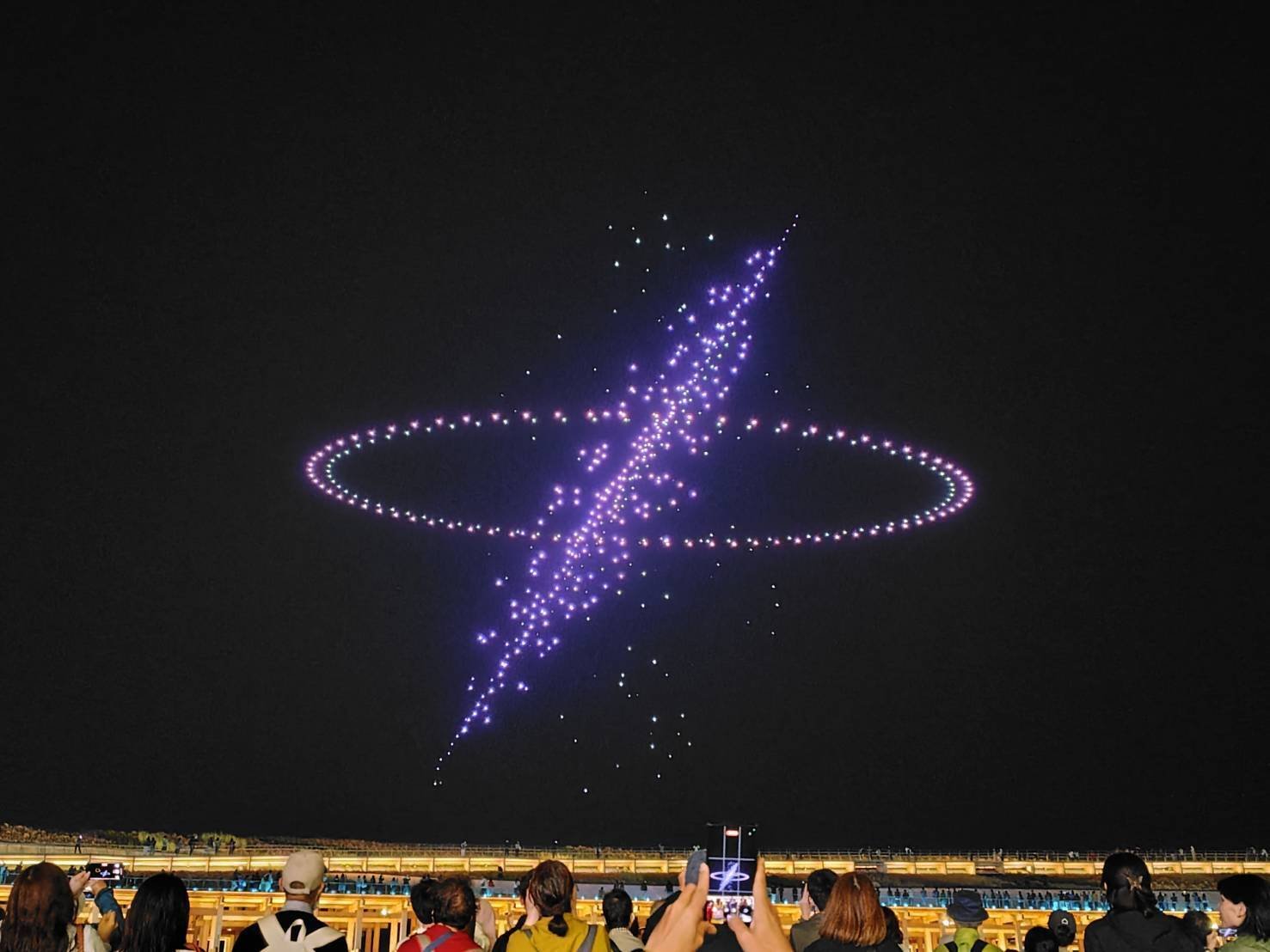 夜空がまるでスクリーンのように様々なシルエットが映し出され、初めて見たドローンショーに驚きました。大量のドローンのブーンって音にも気づくとちょっと笑えてきます(笑)
