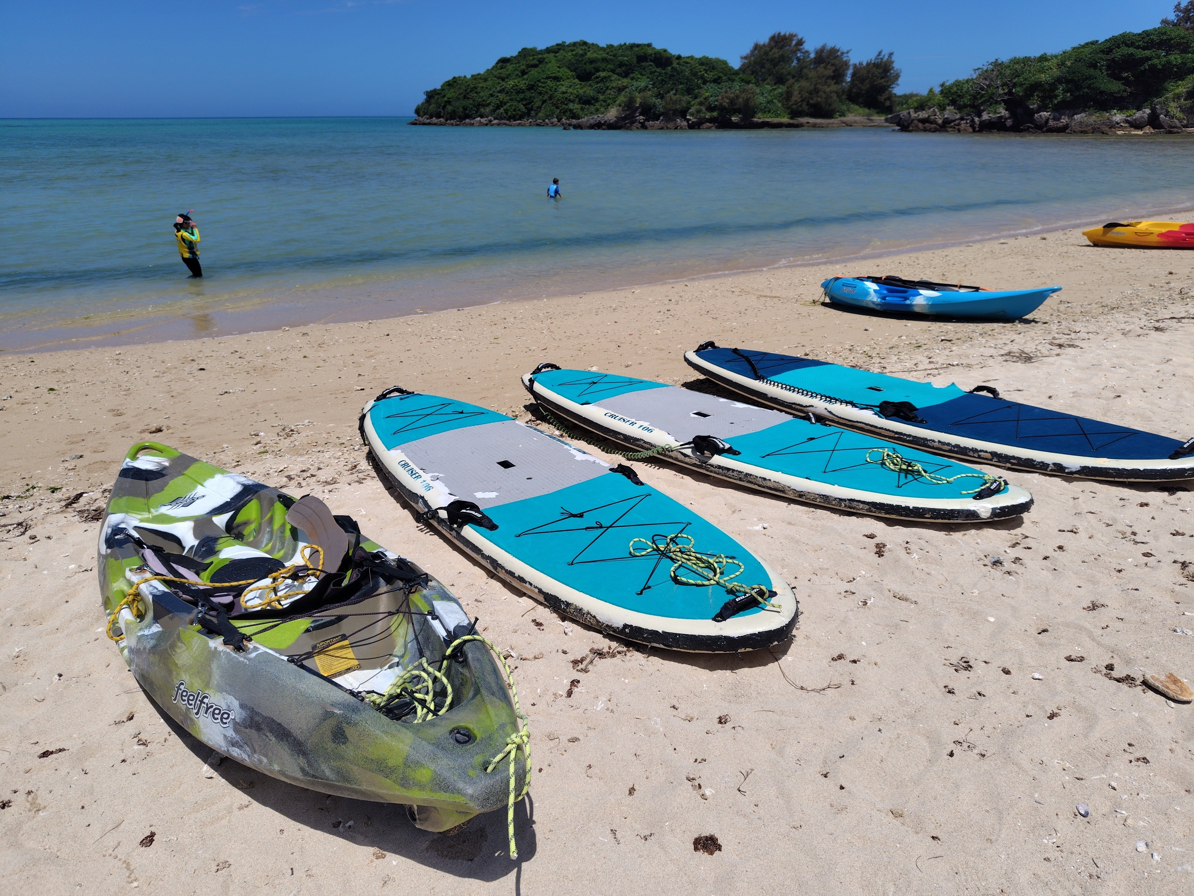 沖縄特有の遠浅で、子どもでも遊びやすいです。私たちはSUPを持参しているので、すぐ近くの小さな島「エージナ島」にも漕いで行けます。