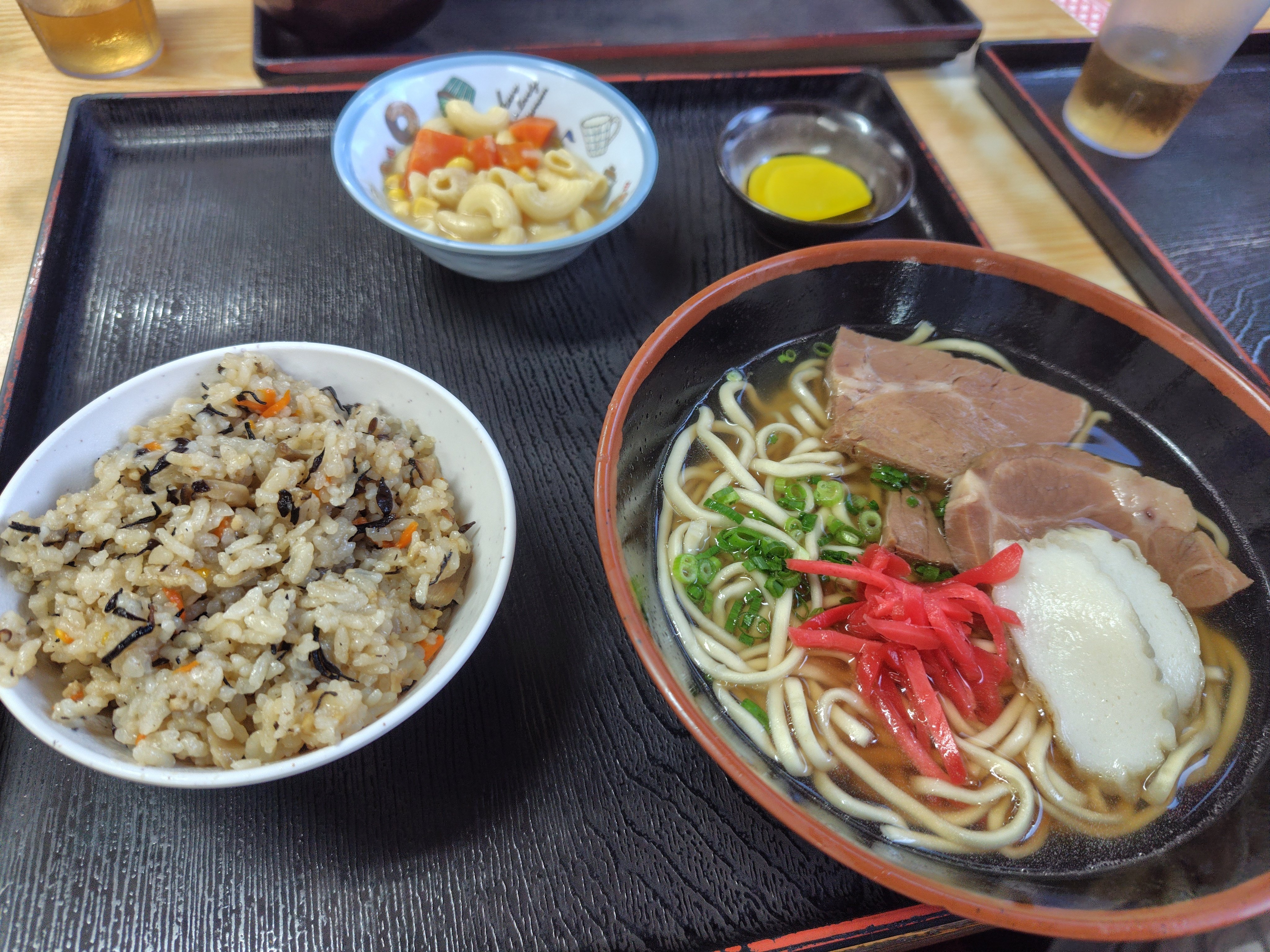 沖縄そばはだしがしっかりしていて、ジューシーもゴーヤチャンプルーも美味しい。夕飯なのに食後にコーヒーも付いてました。ちなみに夕飯時もランチという名の日替わり定食にも驚き。
