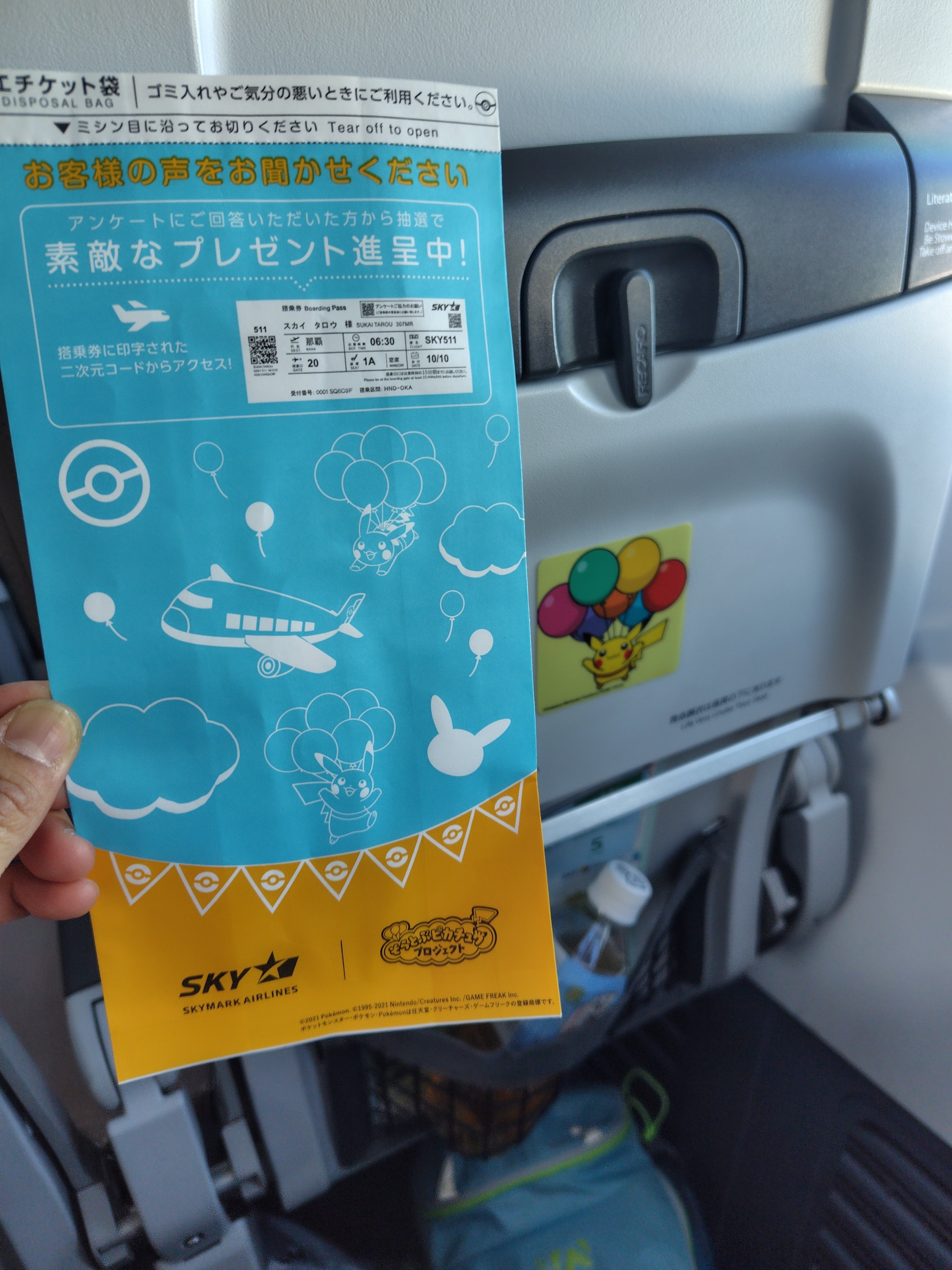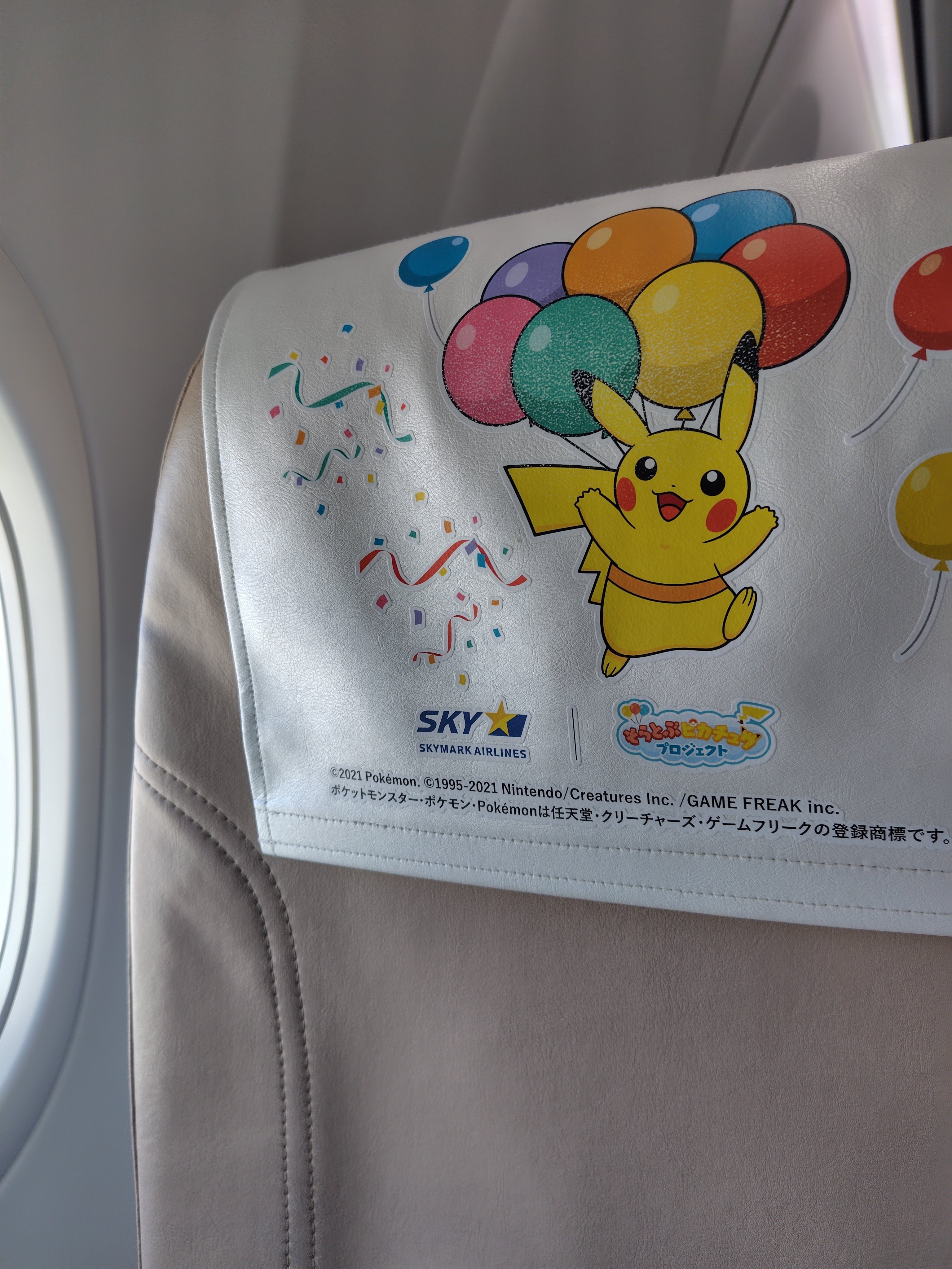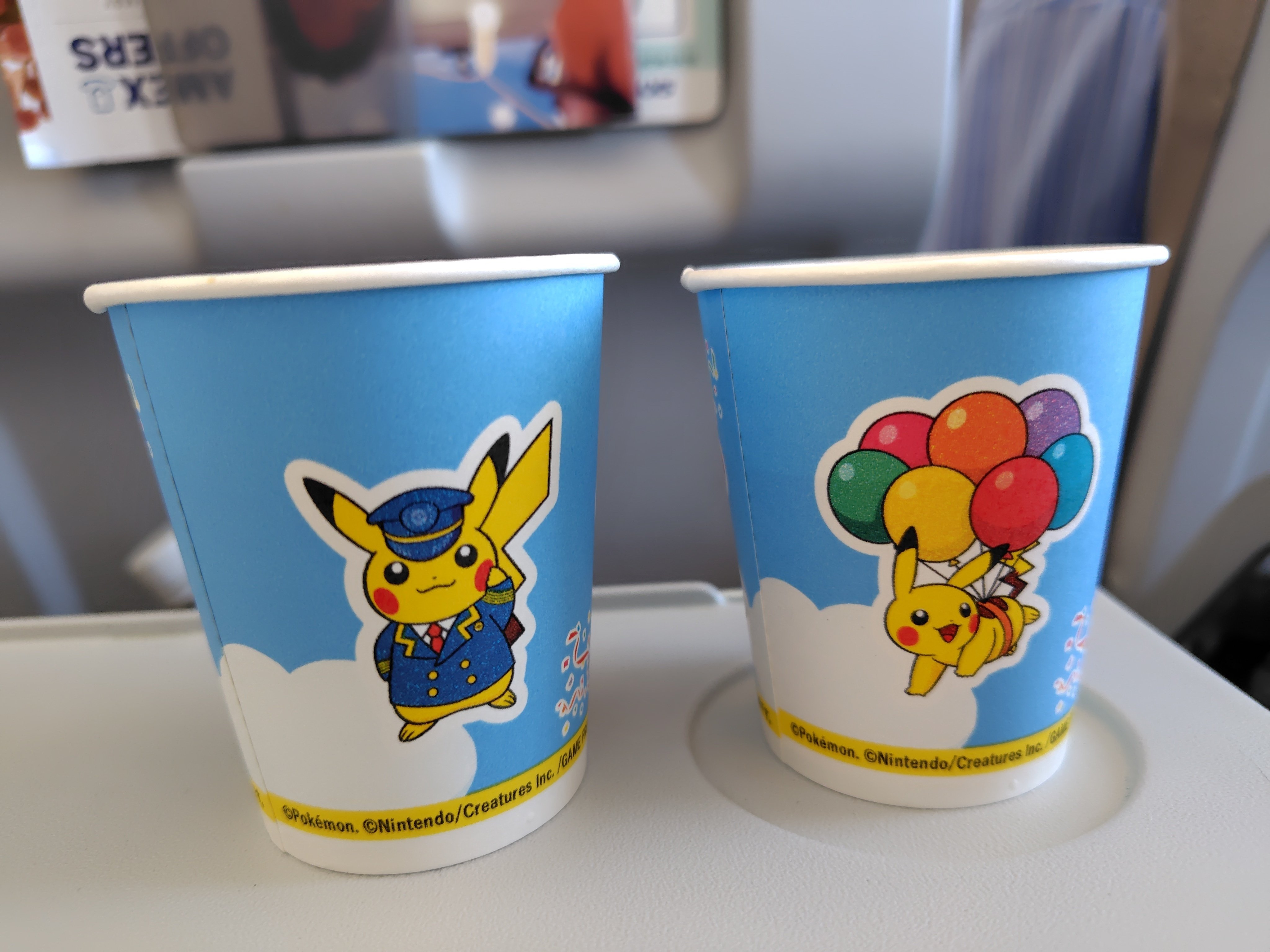 機内はぬいぐるみがあったり、各イスや机、エチケット袋、機内サービスの紙コップ、頭上のライトまでポケモン仕様になっています。